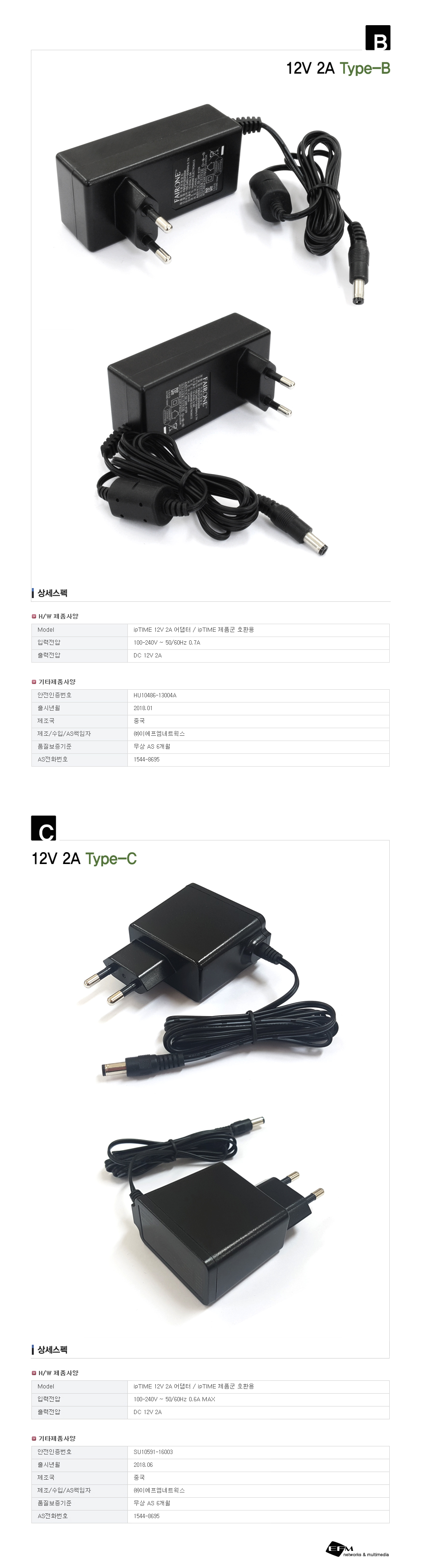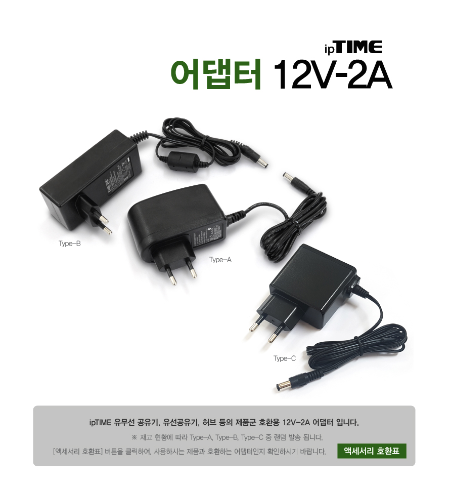 ipTIME 유무선 공유기, 유선공유기, 허브 등의 제품군 호환용 12V-2A 어댑터 입니다.