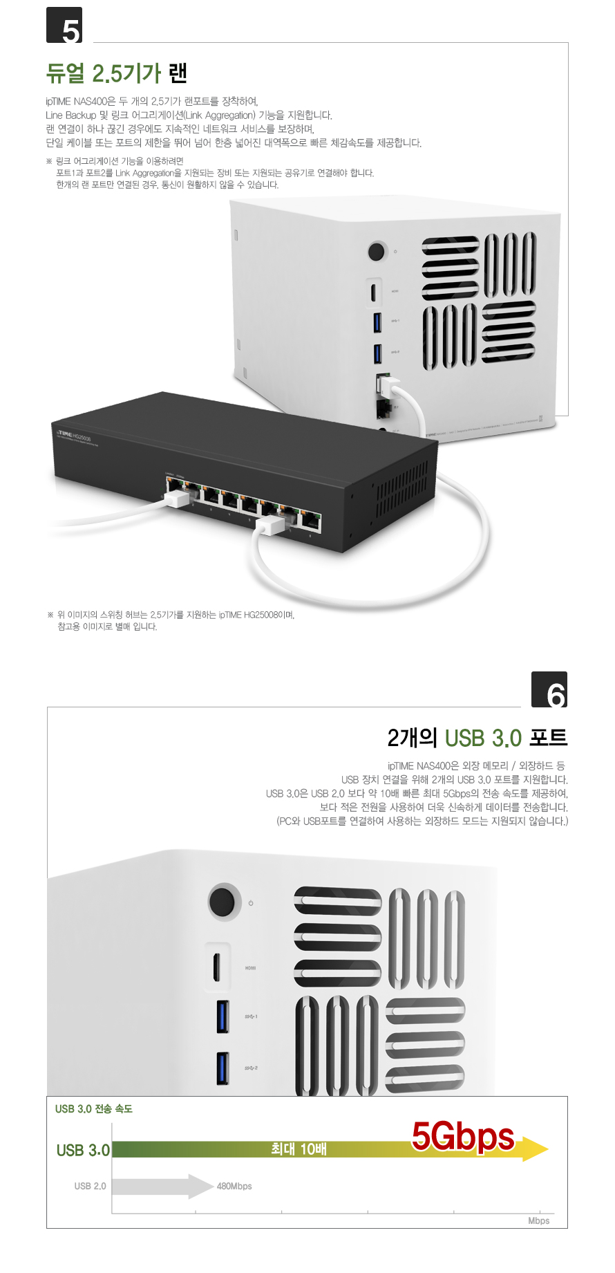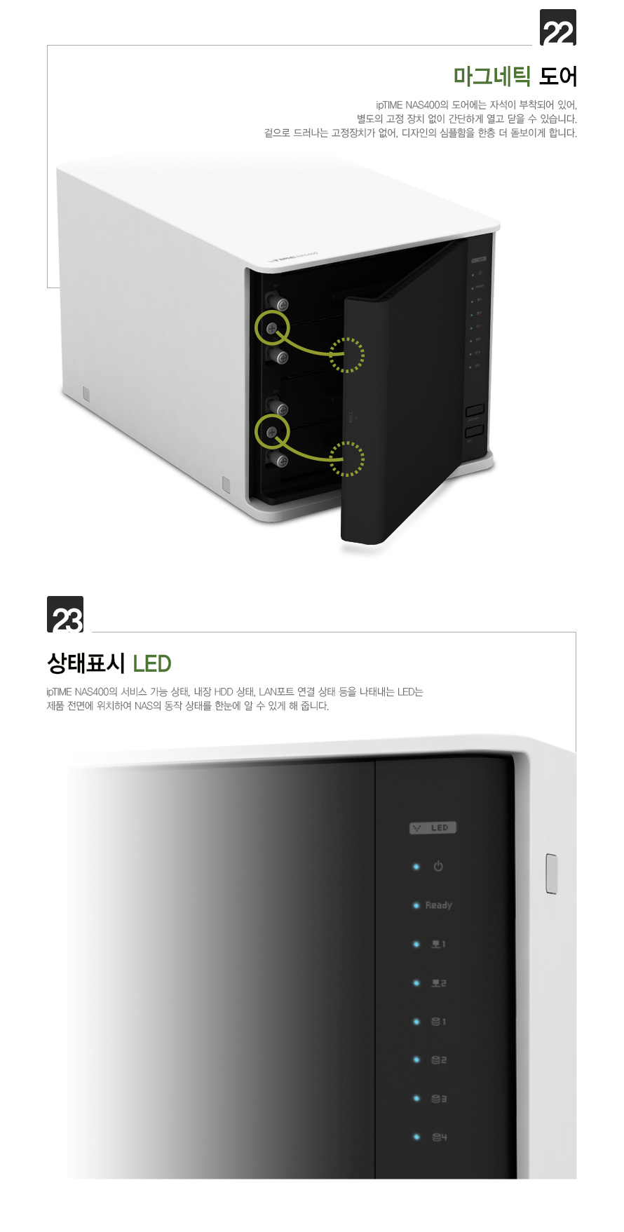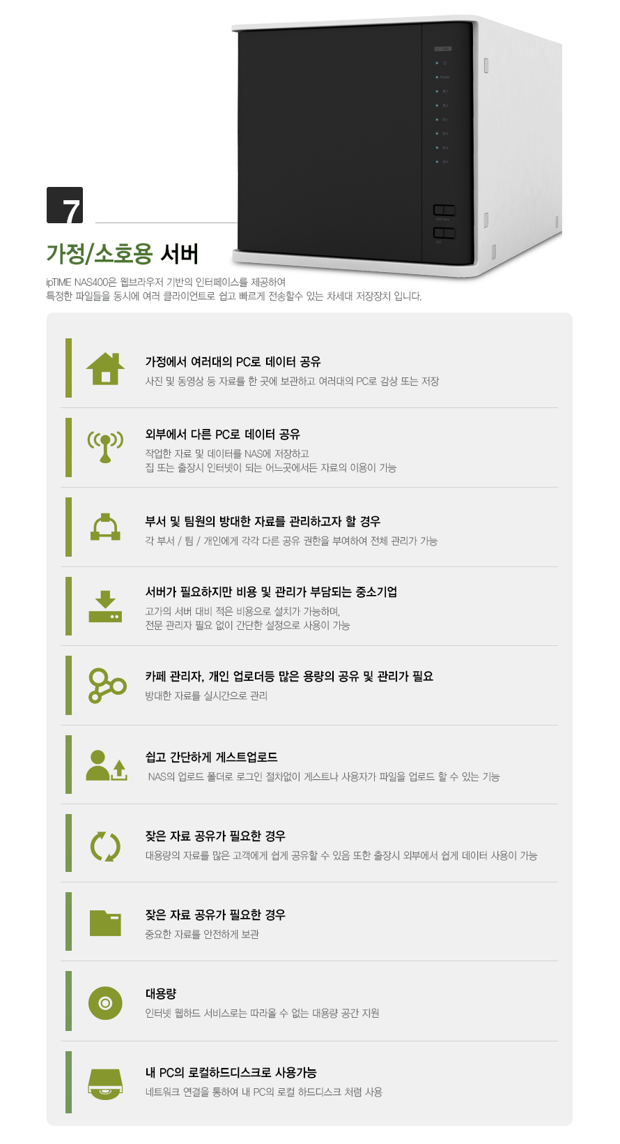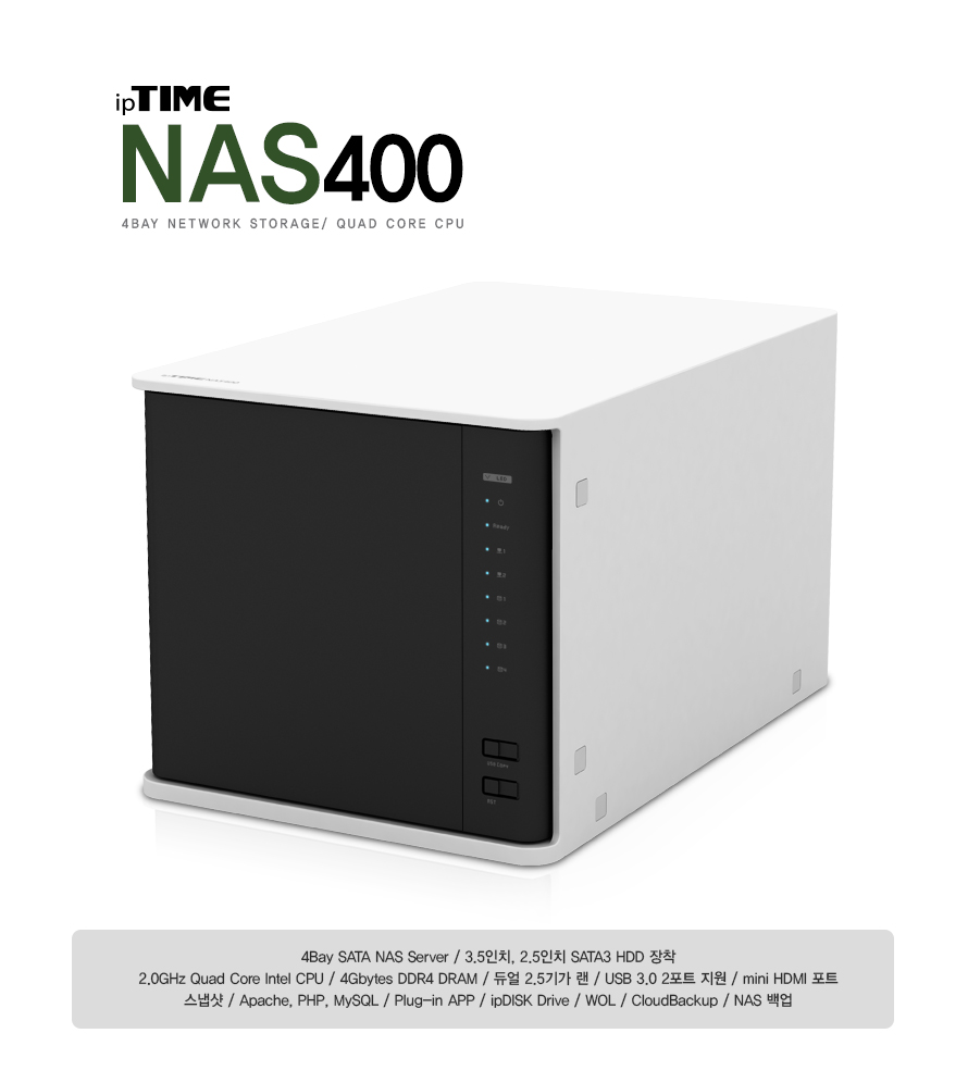 ipTIME NAS400은 유/무선을 이용한 외부 인터넷, 내부 네트워크를 통해 시간과 장소에 관계없이 효율적인 파일 업로드/다운로드를 가능하게 하는 독립된 개인 파일서버 장비입니다.