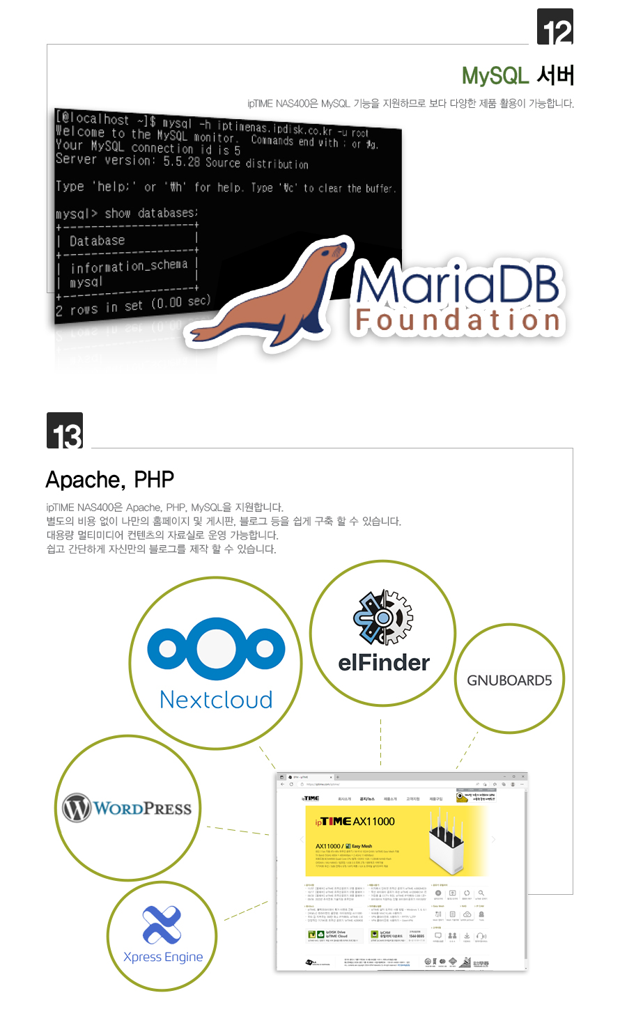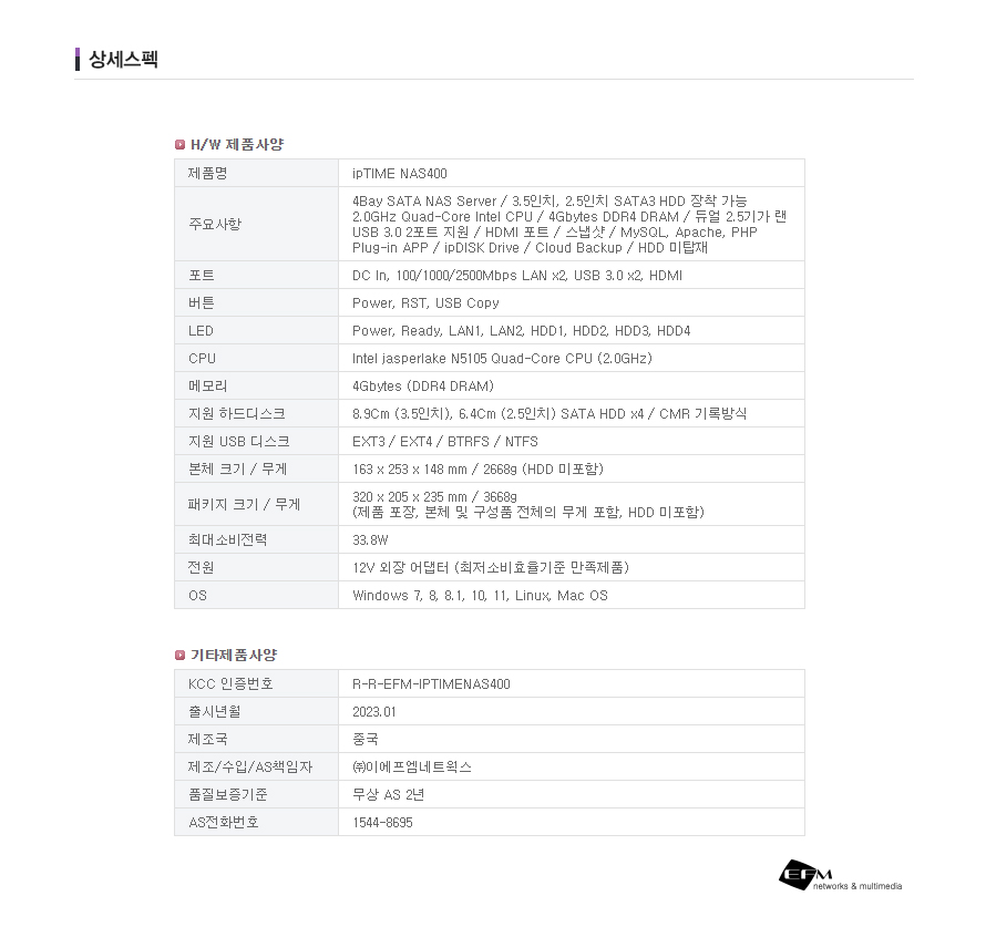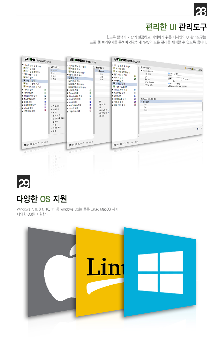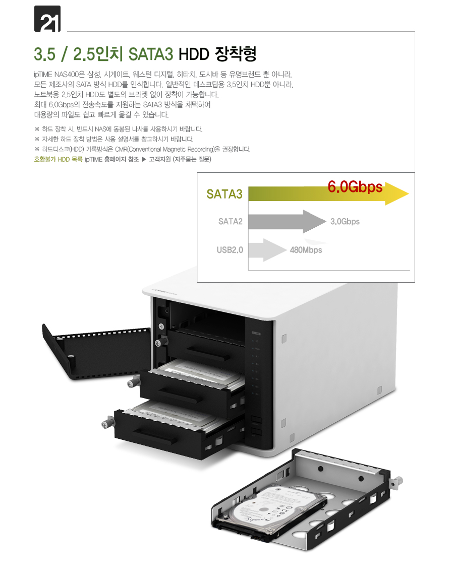 ipTIME NAS400은 유/무선을 이용한 외부 인터넷, 내부 네트워크를 통해 시간과 장소에 관계없이 효율적인 파일 업로드/다운로드를 가능하게 하는 독립된 개인 파일서버 장비입니다.