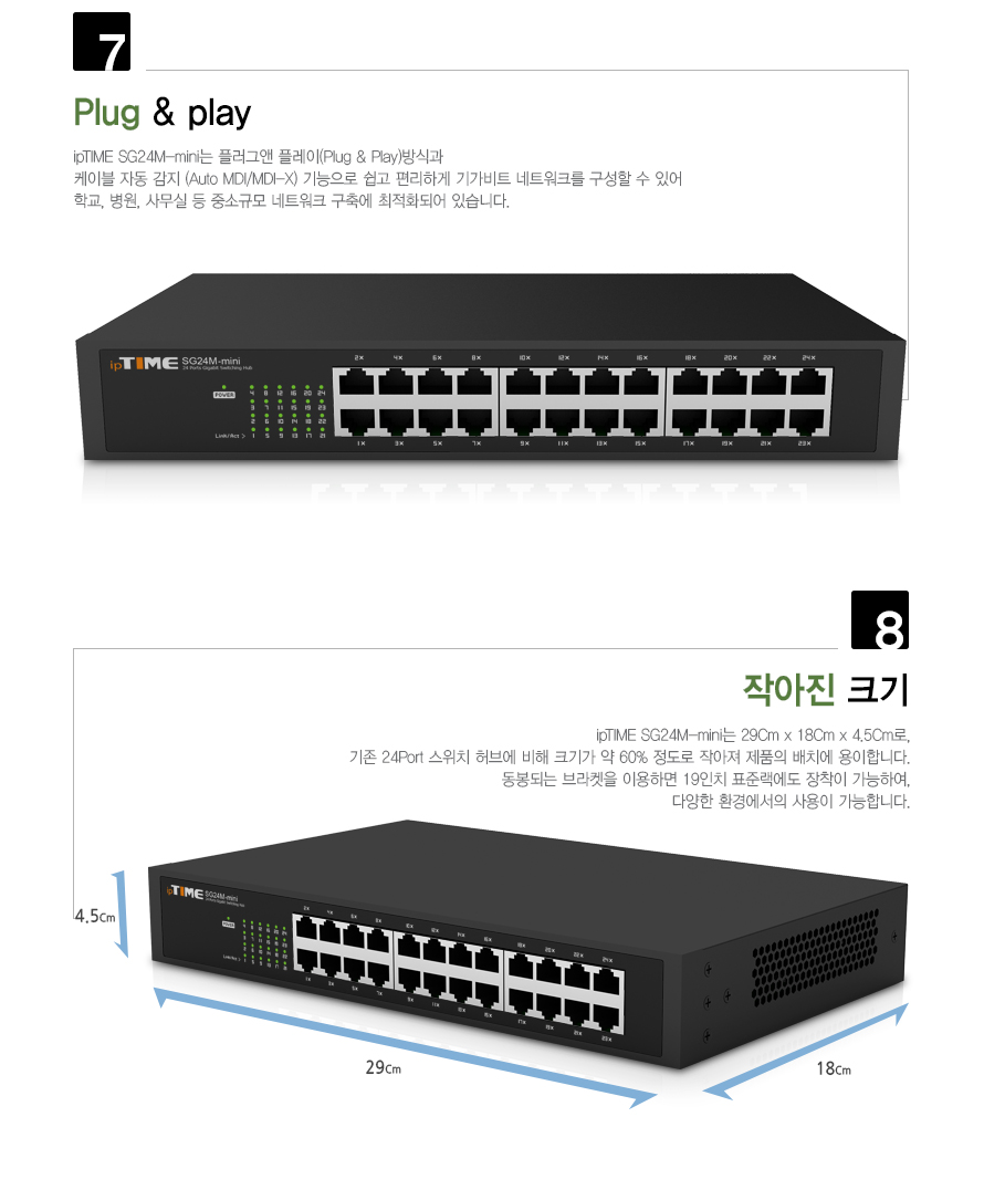 ipTIME SG24M-mini는 24포트가 모두 기가비트로 구성된 스위칭 허브입니다. 기존 100Mbps 지원 허브를 SG24m-mini로 교환하면 간편하게 10배 빠른 네트워크 환경을 구성할 수 있습니다.