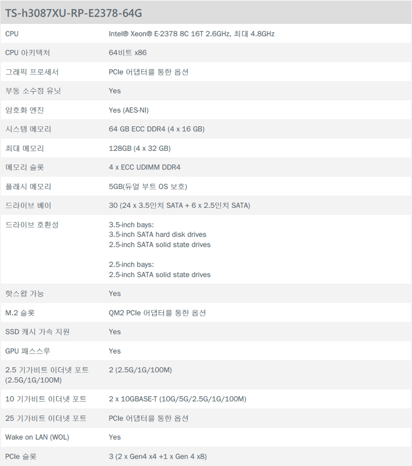 TS-hx87XU-RP 시리즈하이브리드 스토리지를 위해 디자인된 NASTS-hx87XU-RP 랙마운트 NAS 시리즈는 6개의 2.5인치 SSD 베이와 12/16/24 HDD 베이를 갖춘 고유한 6 + x 드라이브 베이 아키텍처를 갖추고 있습니다.