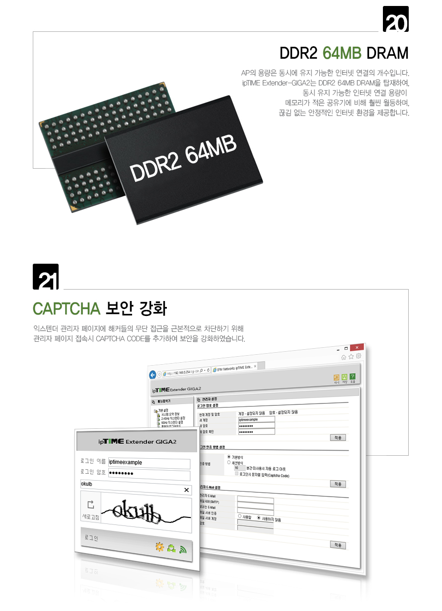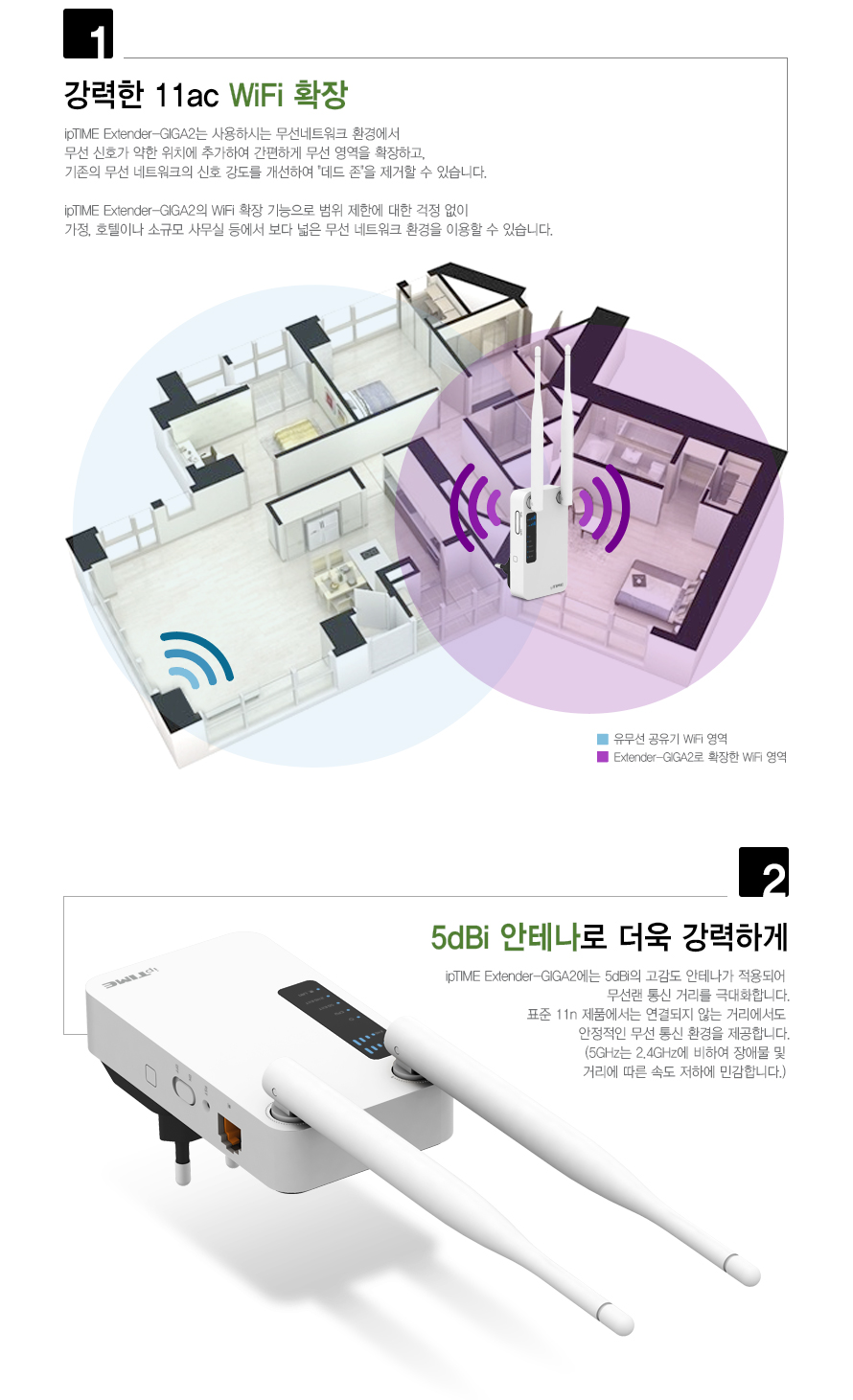 ipTIME Extender-GIGA2는 사용하시는 무선 네트워크 환경에서 무선 신호가 약한 위치에 추가하여 간편하게 무선 영역을 확장하고, 기존의 무선 네트워크 신호 강도를 개선하여 '데드 존'을 제거할 수 있습니다.