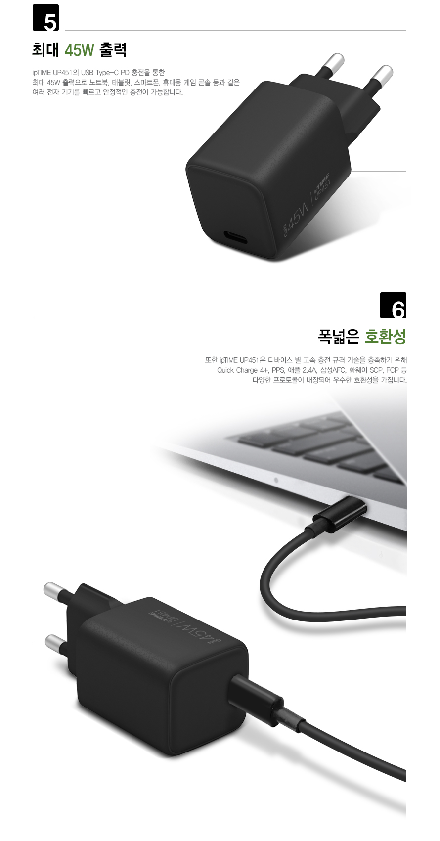 ipTIME UP451은 USB PD(Power Delivery) 3.0 Type-C 포트를 적용하여 일반 USB 포트로는 불가능한 고출력의 전원을 공급할 수 있습니다.