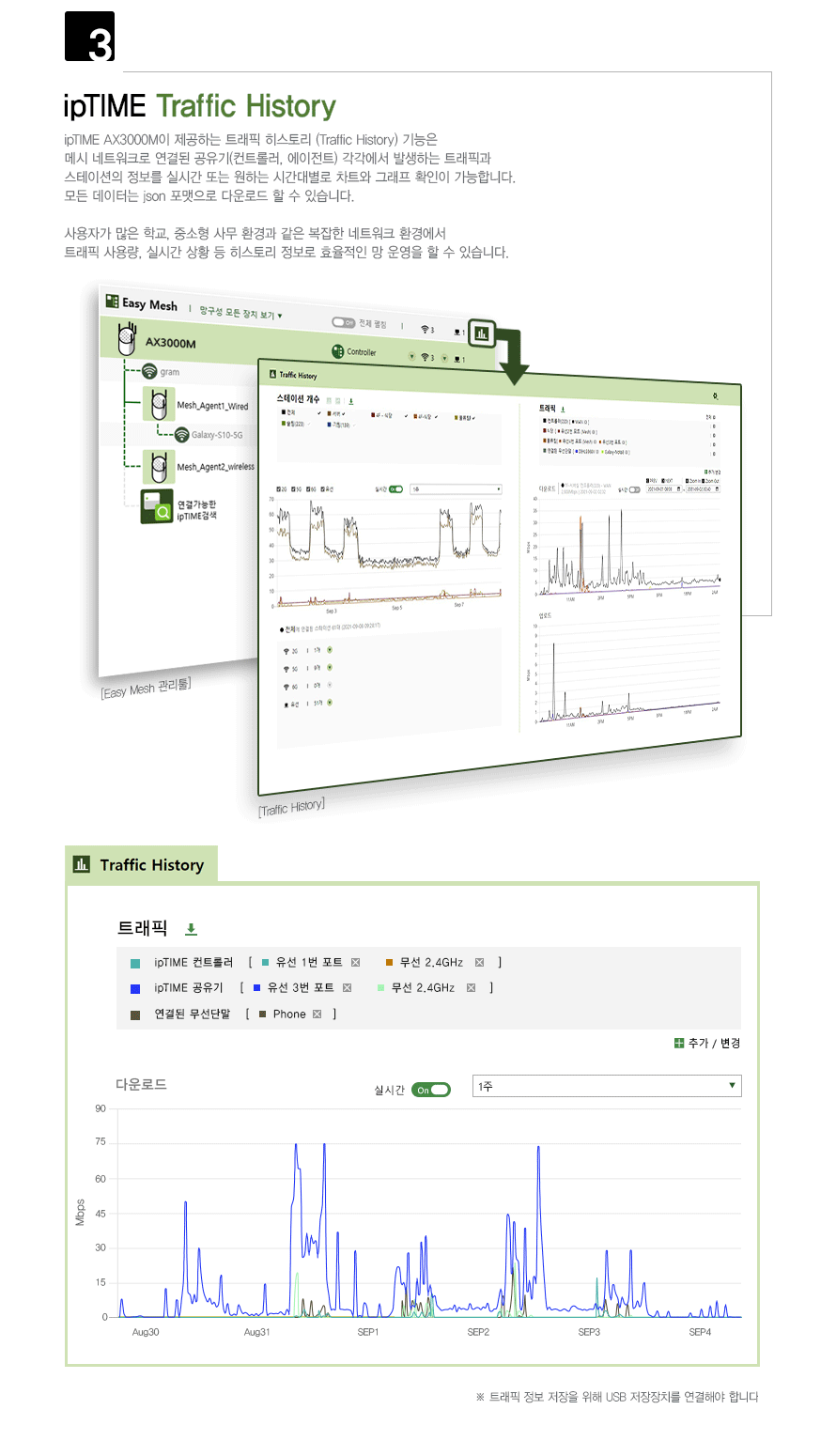 ipTIME AX3000M은 이지메시(Easy Mesh) 기술을 지원하여 공유기 등 무선 네트워크 장치를 그물망(Mesh)처럼 연결하여, 넓은 공간에서의 통합 무선 네트워크를 구축하는 게 가능합니다.