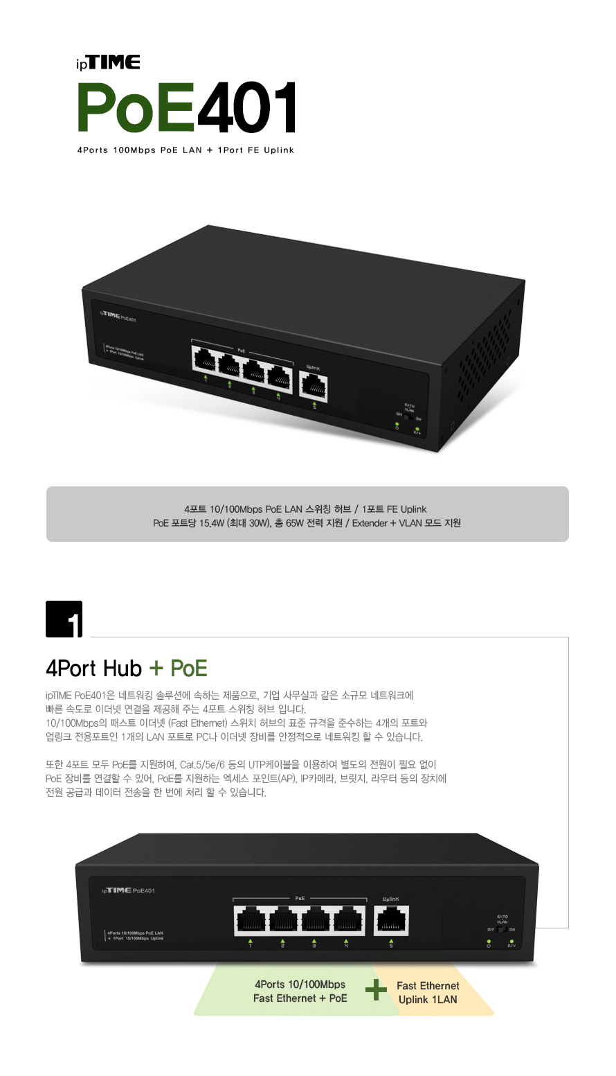 ipTIME PoE401은 네트워킹 솔루션에 속하는 제품으로, 기업 사무실과 같은 소규모 네트워크에 빠른 속도로 이더넷 연결을 제공해주는 4포트 스위칭 허브입니다.