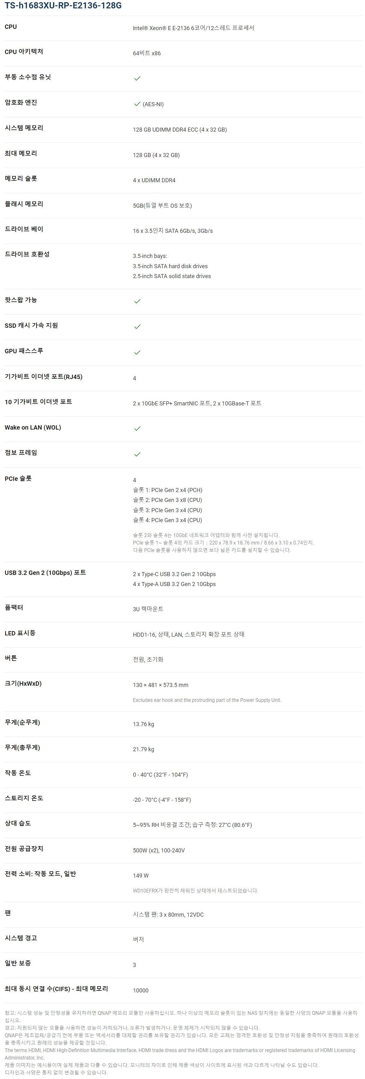 TS-hx83XU-RP 시리즈 QuTS hero NAS는 인텔® 제온® E 프로세서로 구동되며, 최대 128GB DDR4 ECC 메모리를 지원하고, PCIe 확장 기능(사전 설치된 듀얼 포트 10GbE RJ45 어댑터 및 듀얼 포트 10GbE SFP+ SmartNIC)을 제공하여 서버급 성능과 신뢰할 수 있는 안정성을 보장합니다. TS-hx83XU-RP 시리즈는 ZFS 기반 QuTS hero 운영 체제를 활용하여 거의 무제한에 가까운 스냅샷, 실시간 스냅싱크, 블록 레벨 인라인 데이터 중복 제거 및 인라인 데이터 압축을 지원하므로 비즈니스가 안정적인 서비스 수준 협약 성능을 달성하는 데 적합합니다.