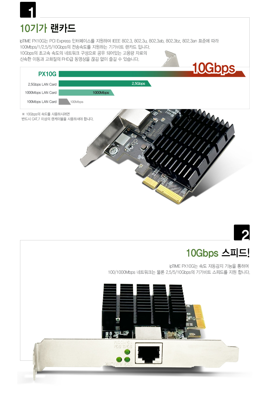 ipTIME PX10G는 PCI Express 인터페이스를 지원하며 여러 IEEE 표준에 따라 100Mbps/1/2.5/5/10Gbps의 전송 속도를 지원하는 기가비트 랜카드입니다.