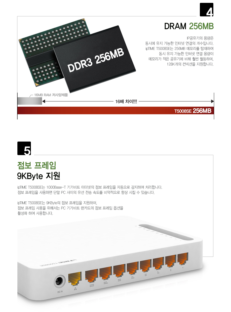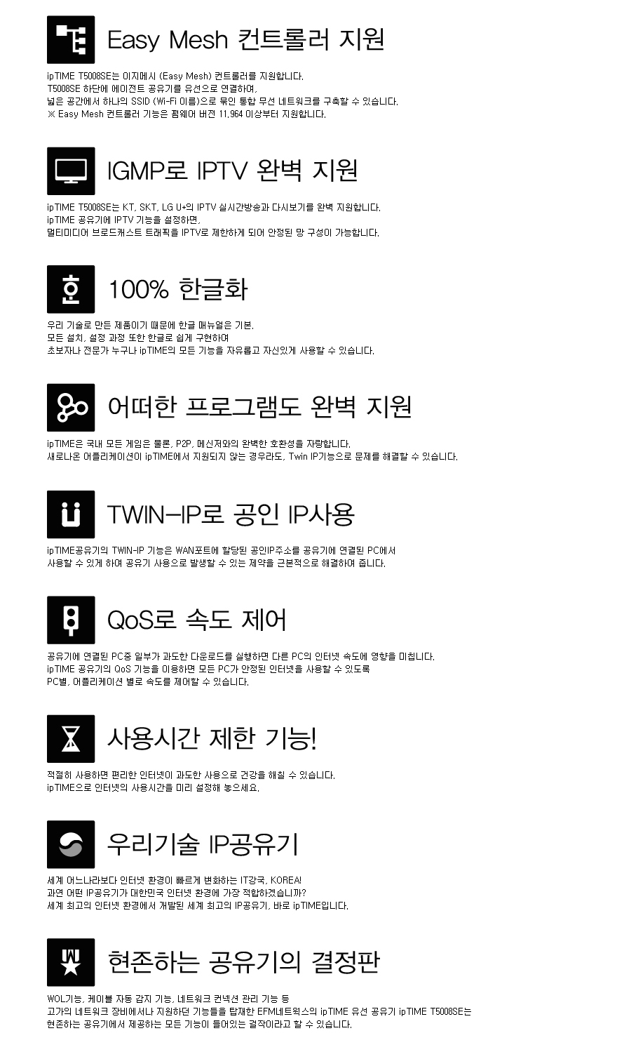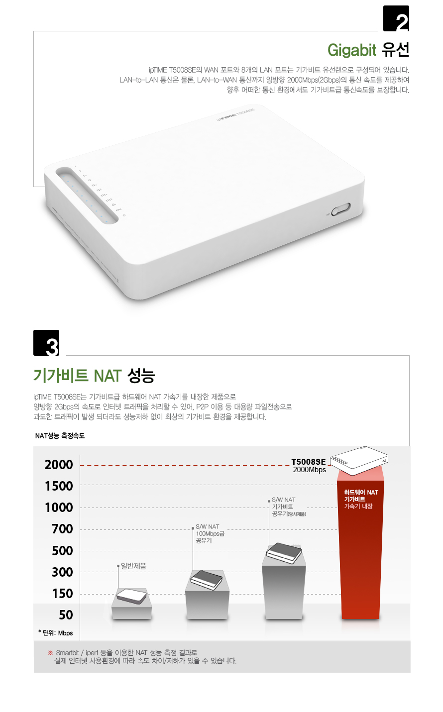 ipTIME T5008SE는 기가비트급 하드웨어 NAT 가속기를 내장한 유선 공유기 제품으로, 양방향 2Gbps의 속도로 인터넷 트래픽을 처리할 수 있는 혁신적인 NAT 성능을 제공합니다.