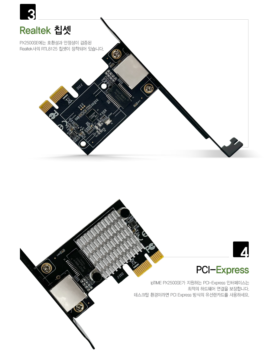 ipTIME PX2500SE는 PCI Express 인터페이스를 지원하며 IEEE 표준에 따라 10/100/1000Mbps/2.5Gbps의 전송속도를 지원하는 기가비트 랜카드입니다.