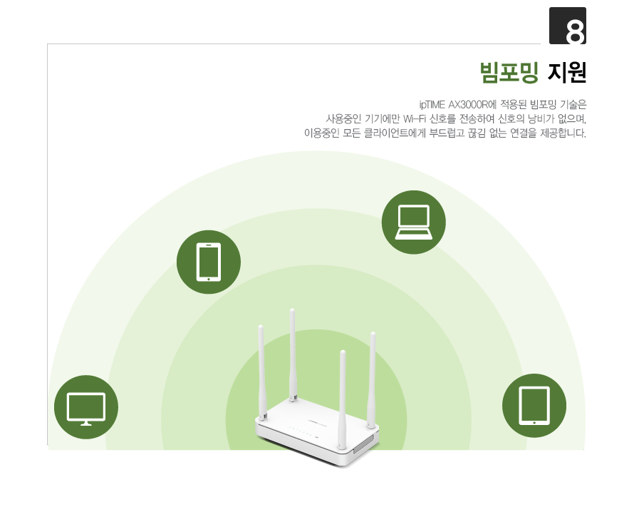 ipTIME AX3000R은 차세대 무선 규격인 IEEE 802.11ax (Wi-Fi 6)를 지원합니다.